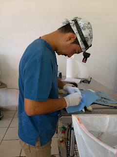 COLONIA INFONAVIT, PUERTO VALLARTA - Fifteen minutes northeast from centro and just before crossing the Pitillal river, the clinic took place in the police station across the road from a dusty park. The small, one-story cement building is empty except for a couple of lockers, a white plastic table and chair and one very relaxed and friendly policeman. There were turn-aways on Wednesday because several people brought in multiple animals. One woman arrived early with a mama dog and her ten silky puppies, all pretty, all wearing blue or pink ribbon collars and all for adoption.